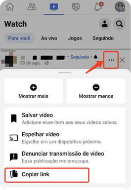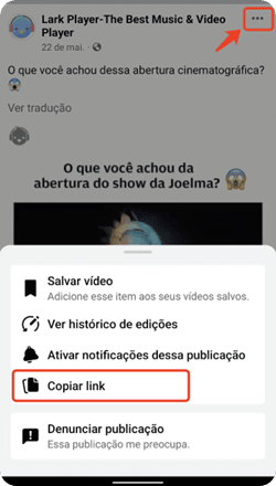 Aceda ao vídeo que quer descarregar pelo navegador ou pela aplicação do Facebook no seu smartphone. Clique um ícone de três pontos e depois clique na opção copiar link.