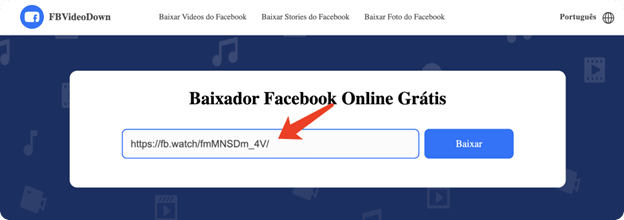 Agora que tem o link copiado, vá para o FBVideoDown. Na página principal da ferramenta vai encontrar um menu no topo. Clique na opção ‘Baixar Vídeos do Facebook’ que está presente neste menu.
