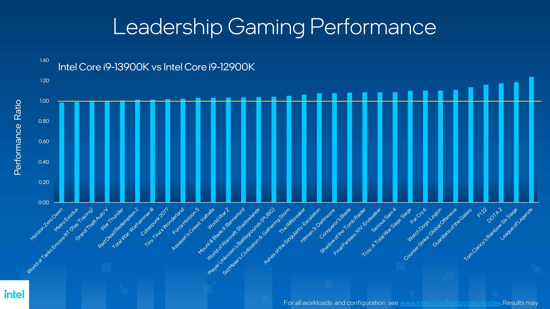 A Intel chegou a revelar resultados de benchmarks, que demonstram o potencial do novo Core i9-13900K face ao seu antecessor, tendo incluído num gráfico o desempenho de alguns modelos rivais da AMD, embora esta inclusão seja algo controversa, pois tratam-se de modelos da anterior geração, e só um dos processadores, o AMD Ryzen 9 5950X teve direito a uma coluna, tendo o AMD Ryzen 7 5800X3D direito a uma mera sinalização no gráfico, e não a uma coluna, como forma de impedir que o novo Core i9-13900K faça má figura face a um processador de “geração anterior”.