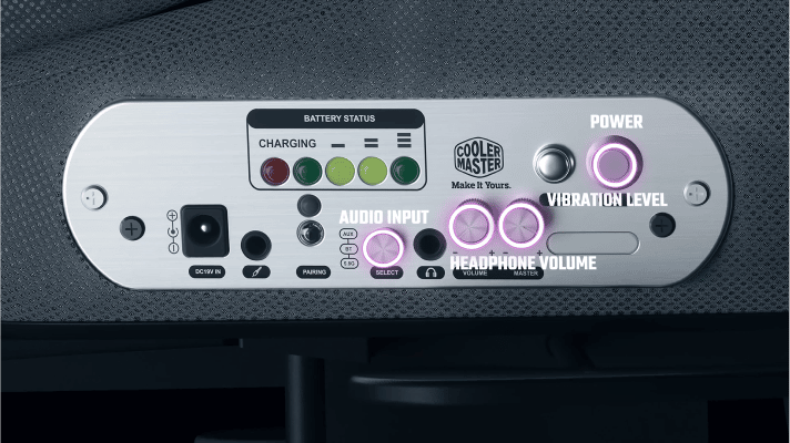 Os controlos estão embutidos na cadeira e permitem ajustar o áudio, o nível de vibração e o volume dos auscultadores. O utilizador também pode usar um dos 7 modos de iluminação RGB incluídos para criar ambientes personalizados.