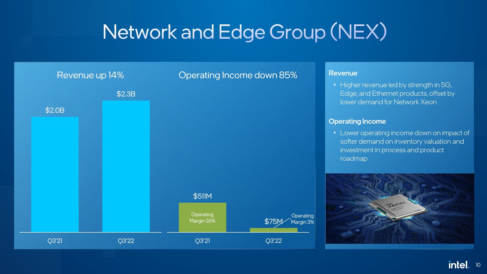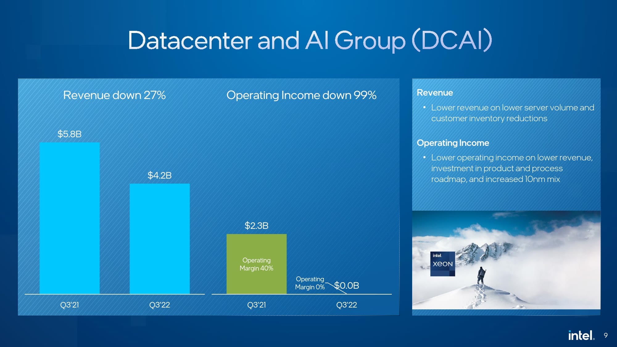 No total, durante o último trimestre, a Intel teve uma receita de 15,3 mil milhões de dólares, o que representa uma queda de 20% face ao mesmo período em 2021. Em termos de margem bruta, a Intel registou 45,9%, o que embora seja um resultado francamente positivo, especialmente tendo em conta os resultados do trimestre anterior, estão aquém do esperado, e 12,4% abaixo da margem obtida no período homólogo.