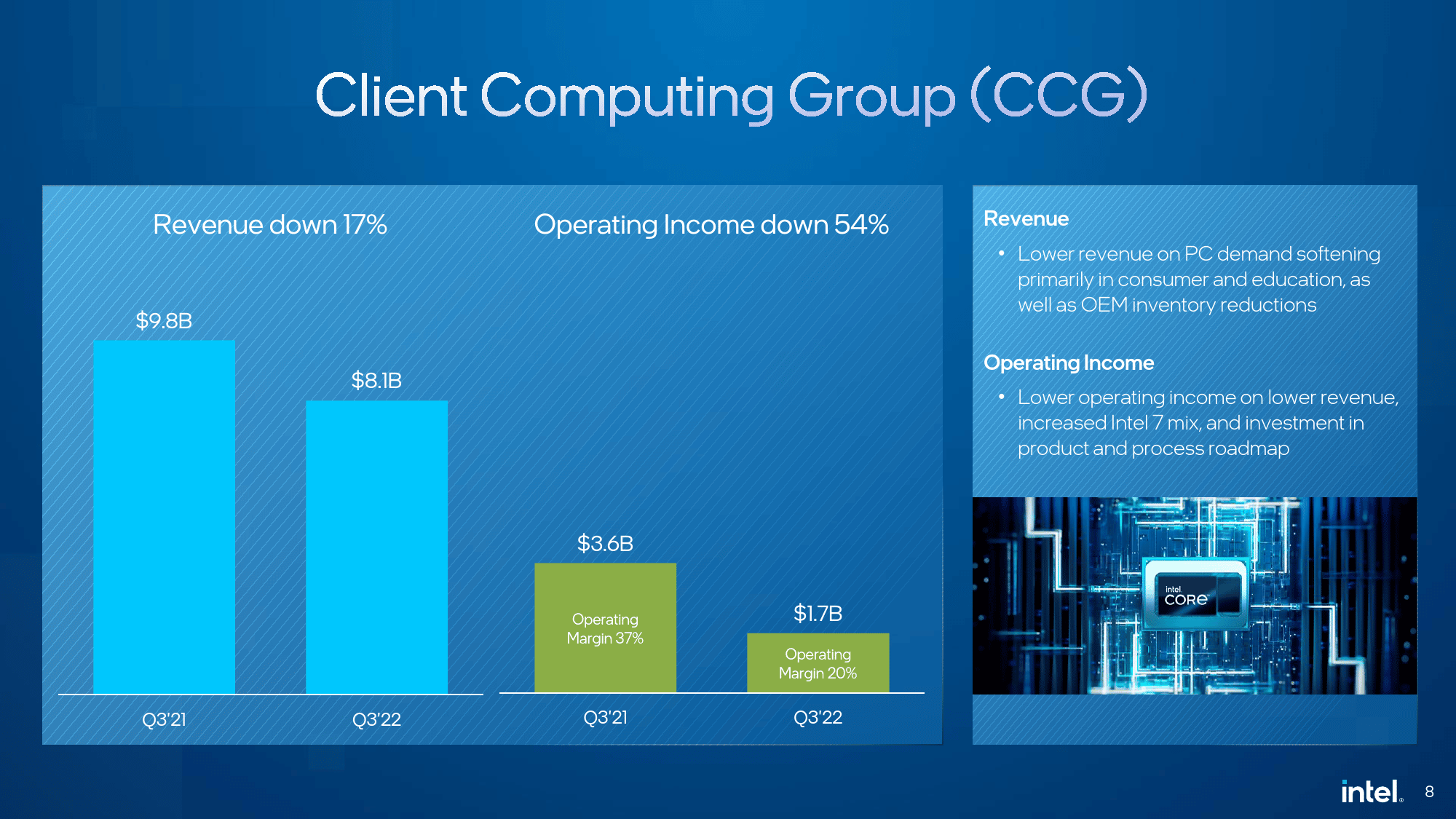 Entre as diversas áreas da empresa, foi a Intel Client Computing Group quem registou os melhores resultados, com 8,1 mil milhões de dólares, mas ainda assim abaixo dos impressionantes 9,8 mil milhões registados no mesmo período em 2021 (queda de 17%). Esta queda deve-se ao menor investimento das pessoas e empresas na compra de novos computadores pessoais e de novos componentes.