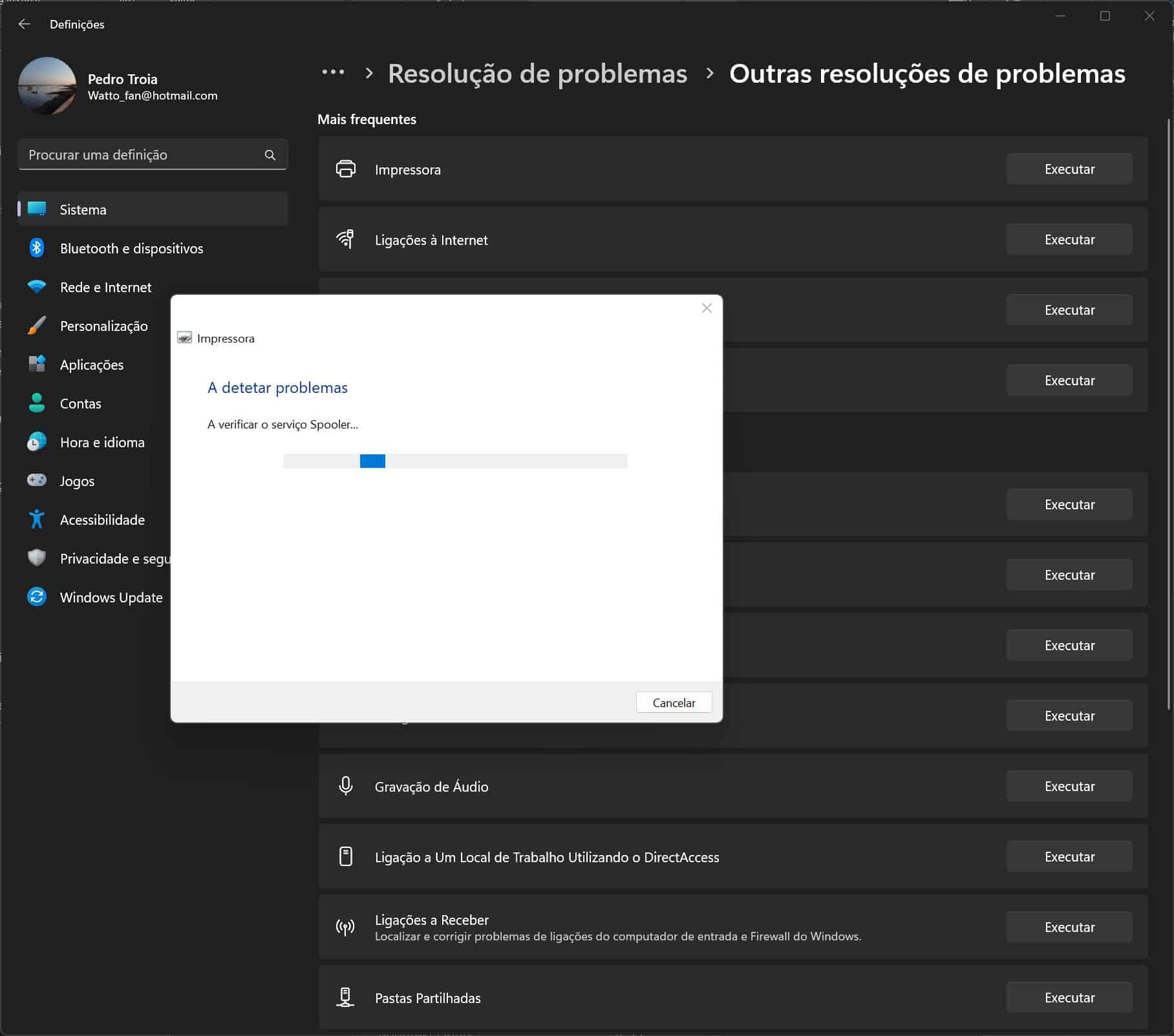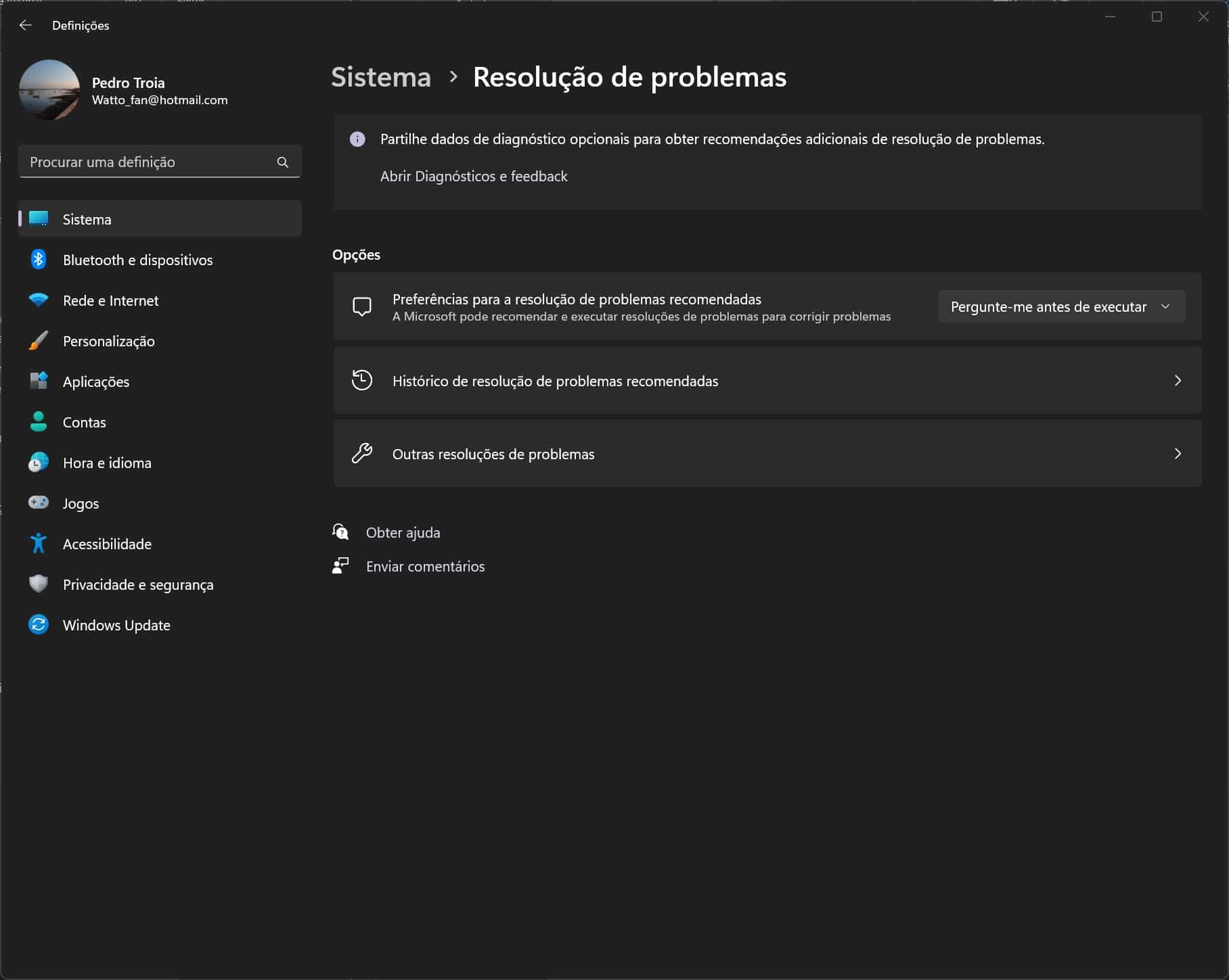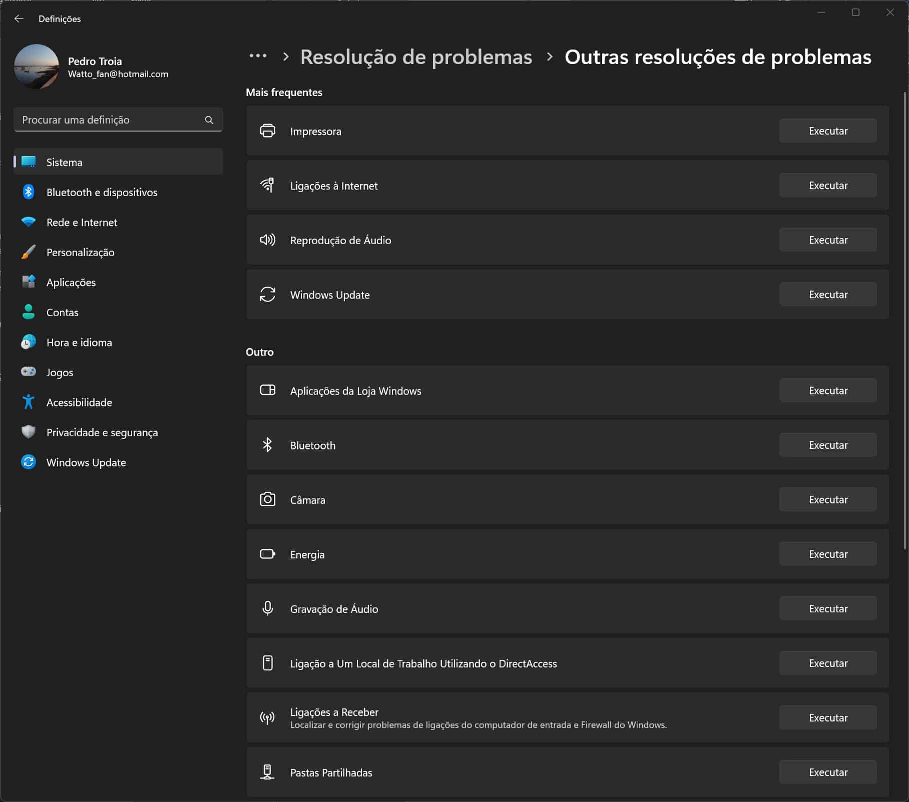 Na janela seguinte, clique em ‘Outras resoluções de problemas’. Nesta janela aparece uma lista dos problemas que podem ser resolvidos através desta ferramenta. Escolha o problema que quiser resolver e clique em ‘Executar’.