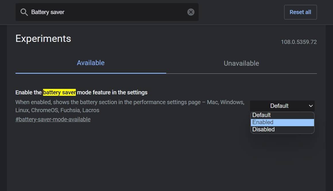 De seguida, escreva:’Battery Saver’. No campo ‘Search flags’.