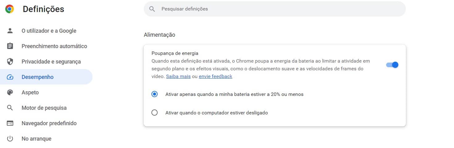 Na página seguinte, certifique-se que o modo de poupança de energia está ligado. Tem duas opções: