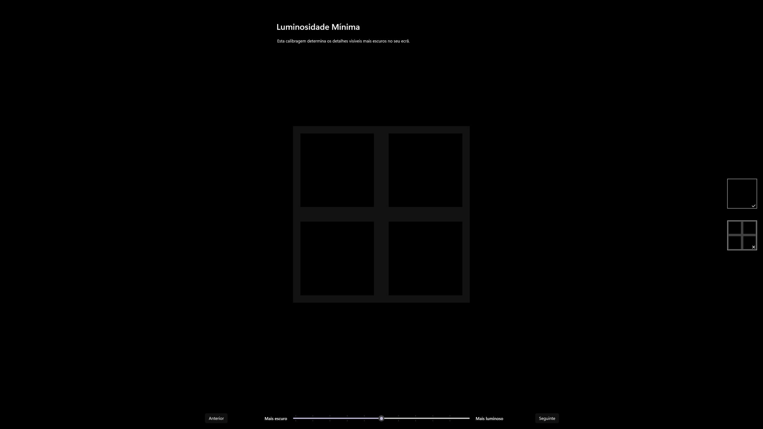 No primeiro passo, use o cursor no fundo do ecrã para escurecer a imagem até que o padrão deixe de estar visível. Este passo serve para determinar o nível de luminosidade mínima, para detectar a partir de que ponto os detalhes mais escuros deixam de ser visíveis. Quando acabar, clique em ‘Seguinte’.