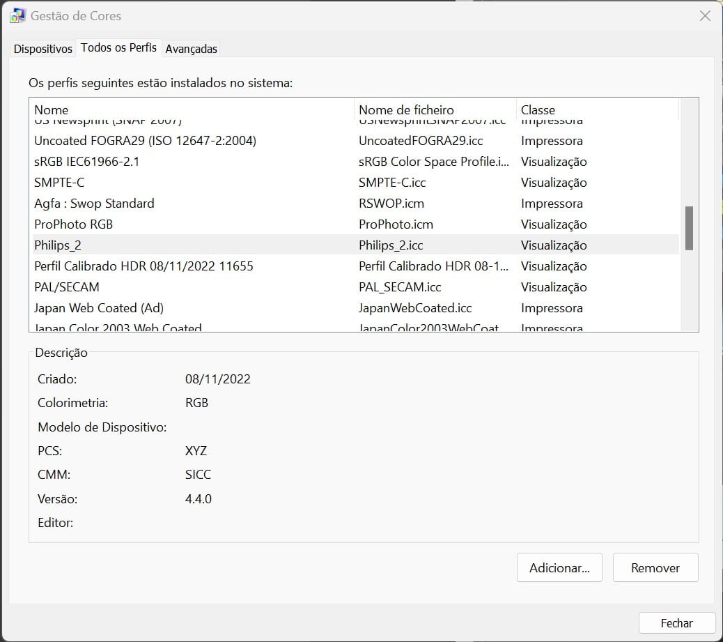 Se quiser apagar um perfil de cor que tenha criado, pode fazê-lo a partir do painel de controlo Gestão de Cores.