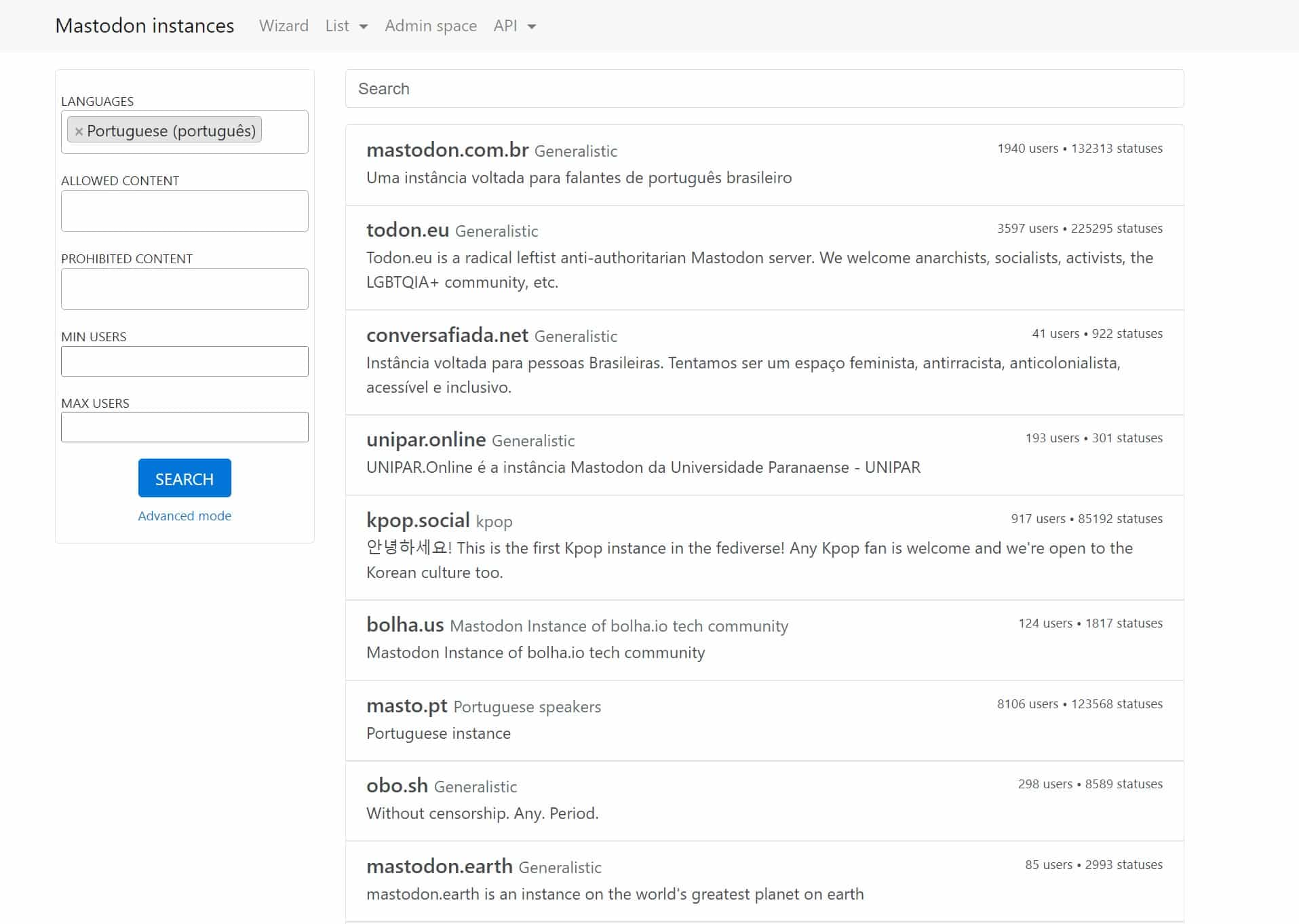 Em alternativa, pode aceder ao site instances.social e pode usar o assistente para encontrar mais servidores segundo os parâmetros que escolher. Os nomes que aparecerem no topo da lista são os dos servidores mais populares.