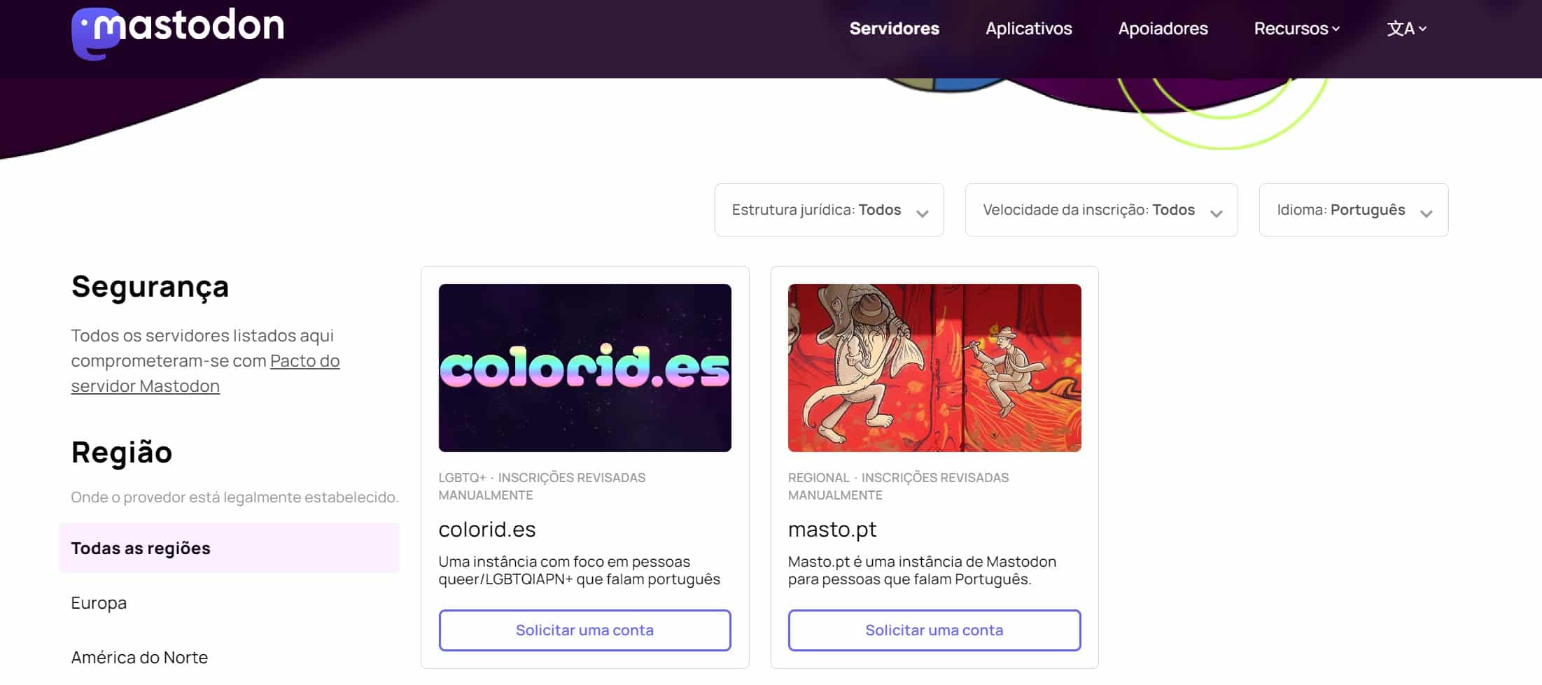 Apesar de, para começar, poder aceder ao site oficial que está em joinmastodon.org, a lista que lá encontra é muito curta. Pode usar os filtros para encontrar o servidor que mais lhe interessa. No nosso caso filtrámos os servidores por língua e só obtivemos 2 resultados para português.