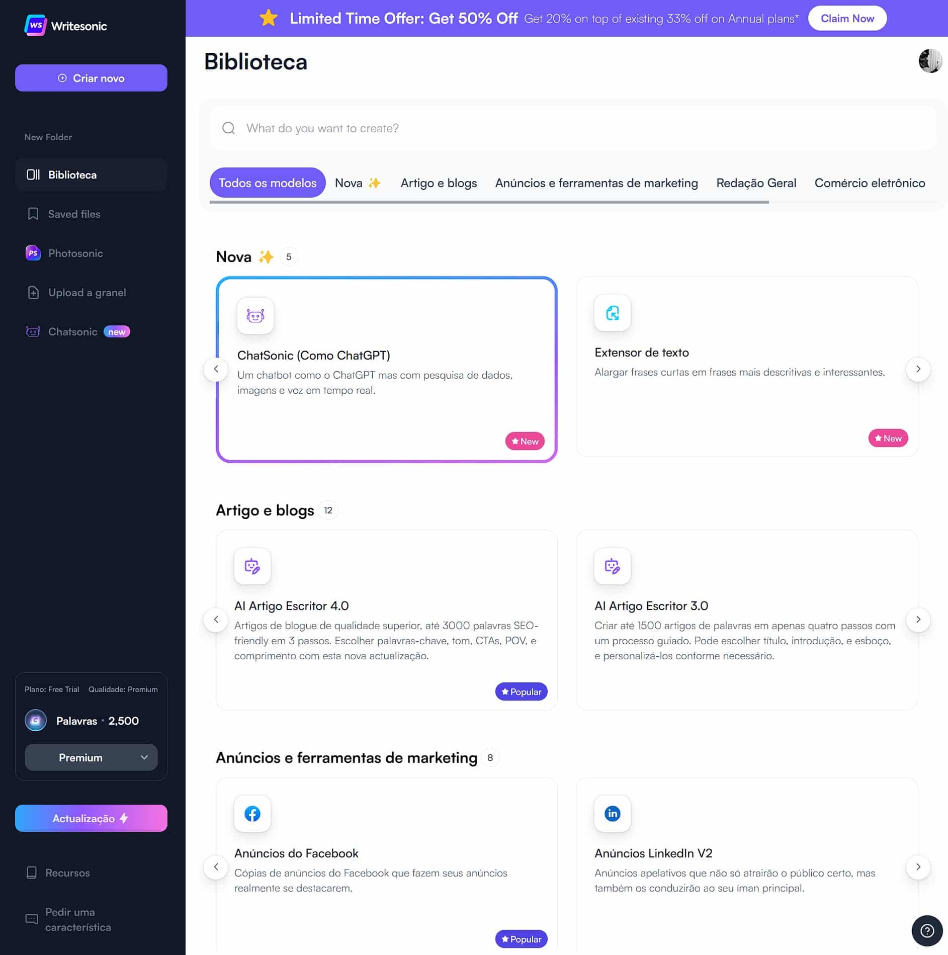 O WriteSonic também tem outras funcionalidades interessantes, como a possibilidade de ser usado por voz e uma funcionalidade de geração de imagens. A versão de experimentação é gratuita e tem um limite de 2500 palavras. Se quiser usá-lo mais seriamente, terá de pagar 12 dólares por mês, que lhe dá direito a 47500 palavras mensais. 5000000 de palavras por mês custam 666 dólares.