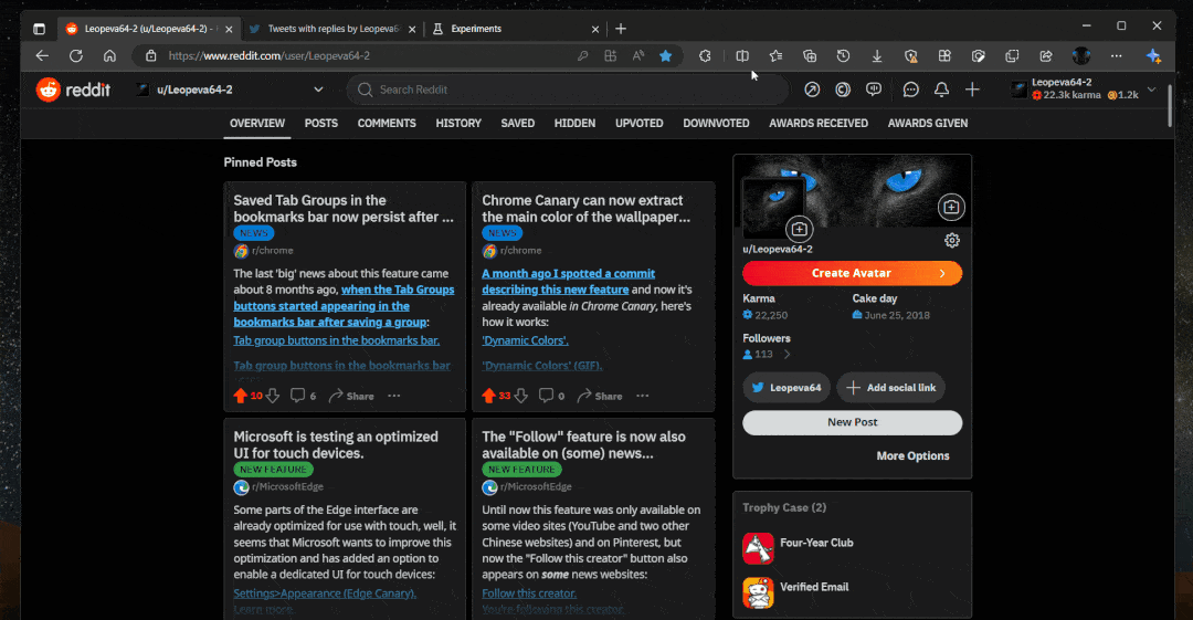 A Microsoft está a testar uma nova funcionalidade no browser Edge que permite ter dois separadores abertos lado a lado. A funcionalidade foi descoberta por um utilizador que a anunciou no Reddit, funcionalidade pode ser ligada através de uma flag nas versões de teste beta, dev e canary do Microsoft Edge. Depois de ligar, aparece um novo botão ao pé do campo onde insere os URL, que permite dividir o espaço de uma janela do browser entre os conteúdos de dois separadores.