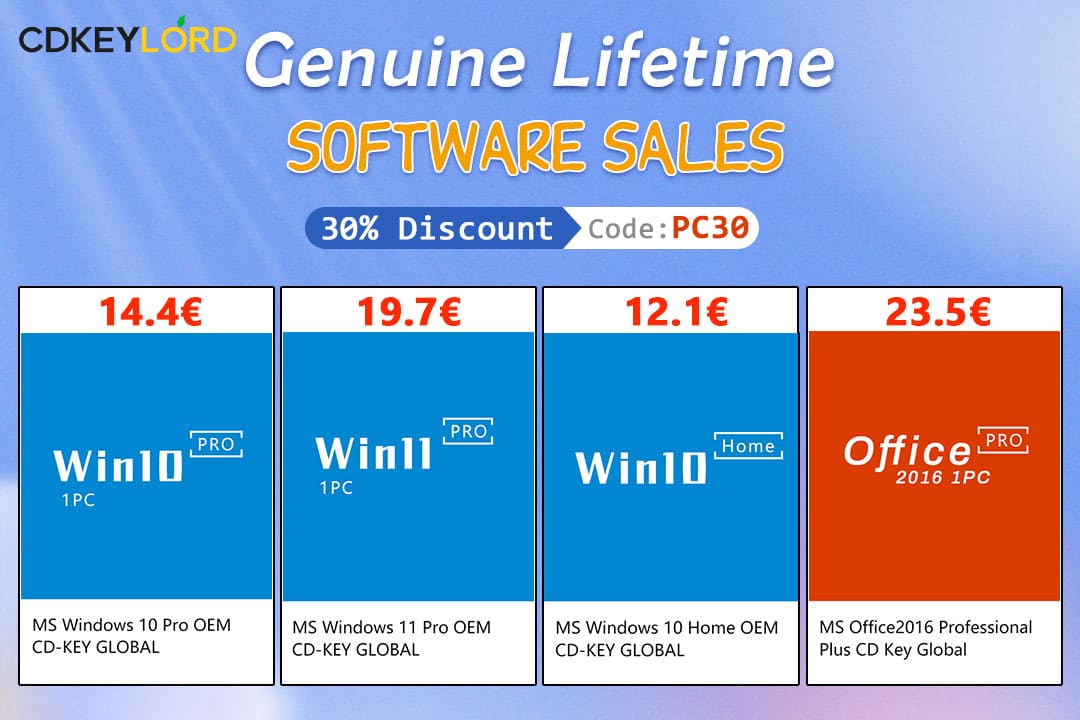 A CDKeylord, vende licenças vitalícias OEM (as mesmas que vêm instaladas quando se compra um PC de qualquer marca) do Windows 10 Pro por apenas 14,4 €, Windows 10 Home por 12,1€ ou Windows 11 Pro por 19,7€. Estes preços são válidos ao usar o código de desconto PC30. O mesmo código, PC30, também pode ser usado para obter um desconto de 30% em licenças do Office 2016 e 2019 Pro ou em conjuntos de Windows 10 Pro mais o Office, para que possa começar logo a trabalhar.