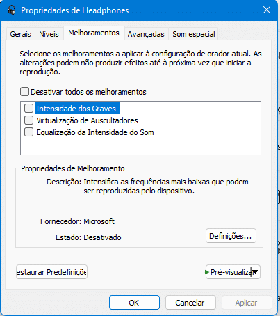 O Windows 11 tem funcionalidades adicionais para melhorar a qualidade som, com realce dos graves, som surround virtual, e loudness. Note que estas opções dependem do hardware que estiver a usar e dos drivers do dispositivo de som em questão. Por isso, as opções podem ser diferentes, ou não estarem disponíveis em todos os dispositivos. Neste caso, vamos abordar apenas as que vêm incluídas no Windows 11.