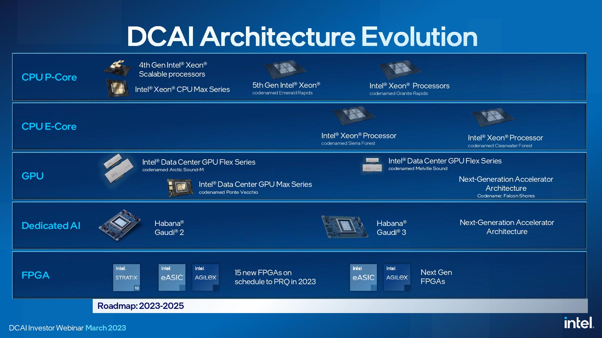 Para os modelos equipados com núcleos P, a Intel irá lançar no final do presente ano os novos Xeon Emerald Rapids, que serão os sucessores dos actuais Sapphire Rapids, que foram lançados somente no início do presente ano, e que deverão utilizar uma estrutura similar, com até 64 núcleos, embora do tipo Raptor Cove, idênticos aos utilizados pelos Intel Core de 13ª geração Raptor Lake.