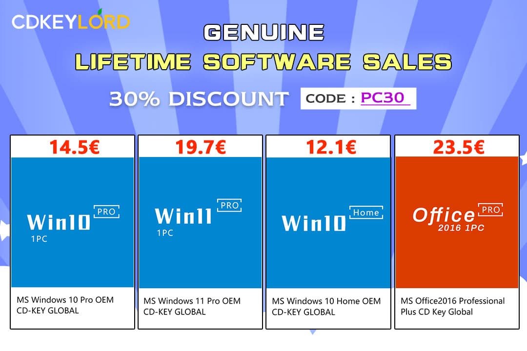 A CDKeylord, vende licenças vitalícias OEM (as mesmas que vêm instaladas quando se compra um PC de qualquer marca) do Windows 10 Pro por apenas 14,4€, Windows 10 Home por 12,1€ ou Windows 11 Pro por 19,7€. Estes preços são válidos ao usar o código de desconto PC30. O mesmo código, PC30, também pode ser usado para obter um desconto de 30% em licenças do Office 2016 e 2019 Pro ou em conjuntos de Windows 10 Pro mais o Office, para que possa começar logo a trabalhar.
