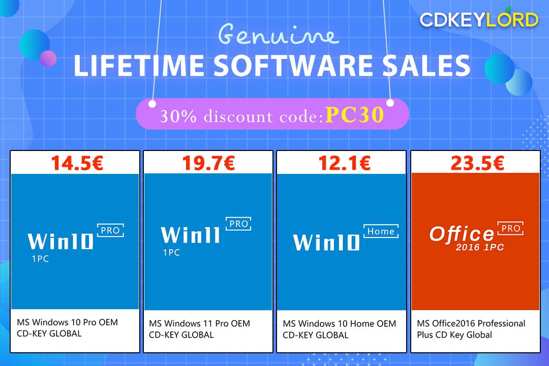 A CDKeylord, vende licenças vitalícias OEM (as mesmas que vêm instaladas quando se compra um PC de qualquer marca) do Windows 10 Pro por apenas 14,4€, Windows 10 Home por 12,1€ ou Windows 11 Pro por 19,7€. Estes preços são válidos ao usar o código de desconto PC30. O mesmo código, PC30, também pode ser usado para obter um desconto de 30% em licenças do Office 2016 e 2019 Pro ou em conjuntos de Windows 10 Pro mais o Office, para que possa começar logo a trabalhar.
