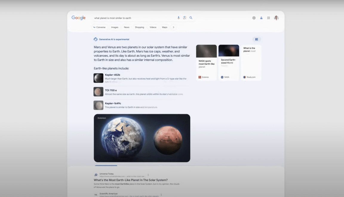 Durante a conferência, a Google mostrou um pouco da nova “Search Generative Experience”, que coloca respostas geradas por Inteligência Artificial no topo da página com os resultados da busca feita pelo utilizador com os links para as páginas um pouco mais abaixo.