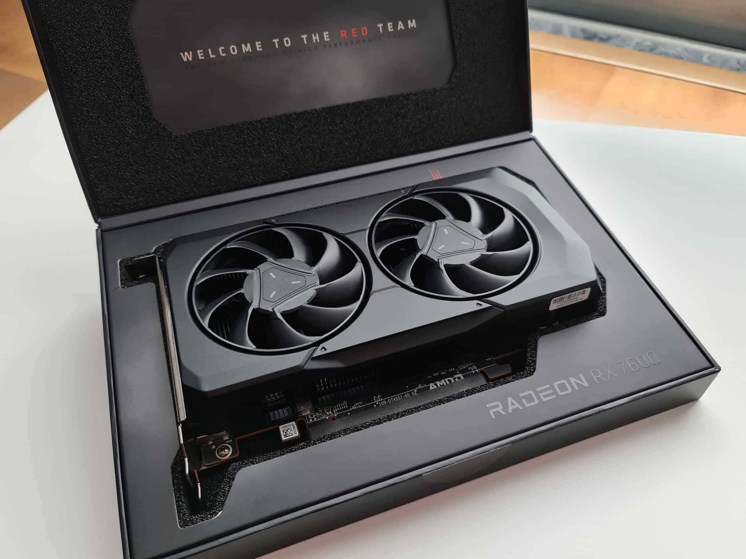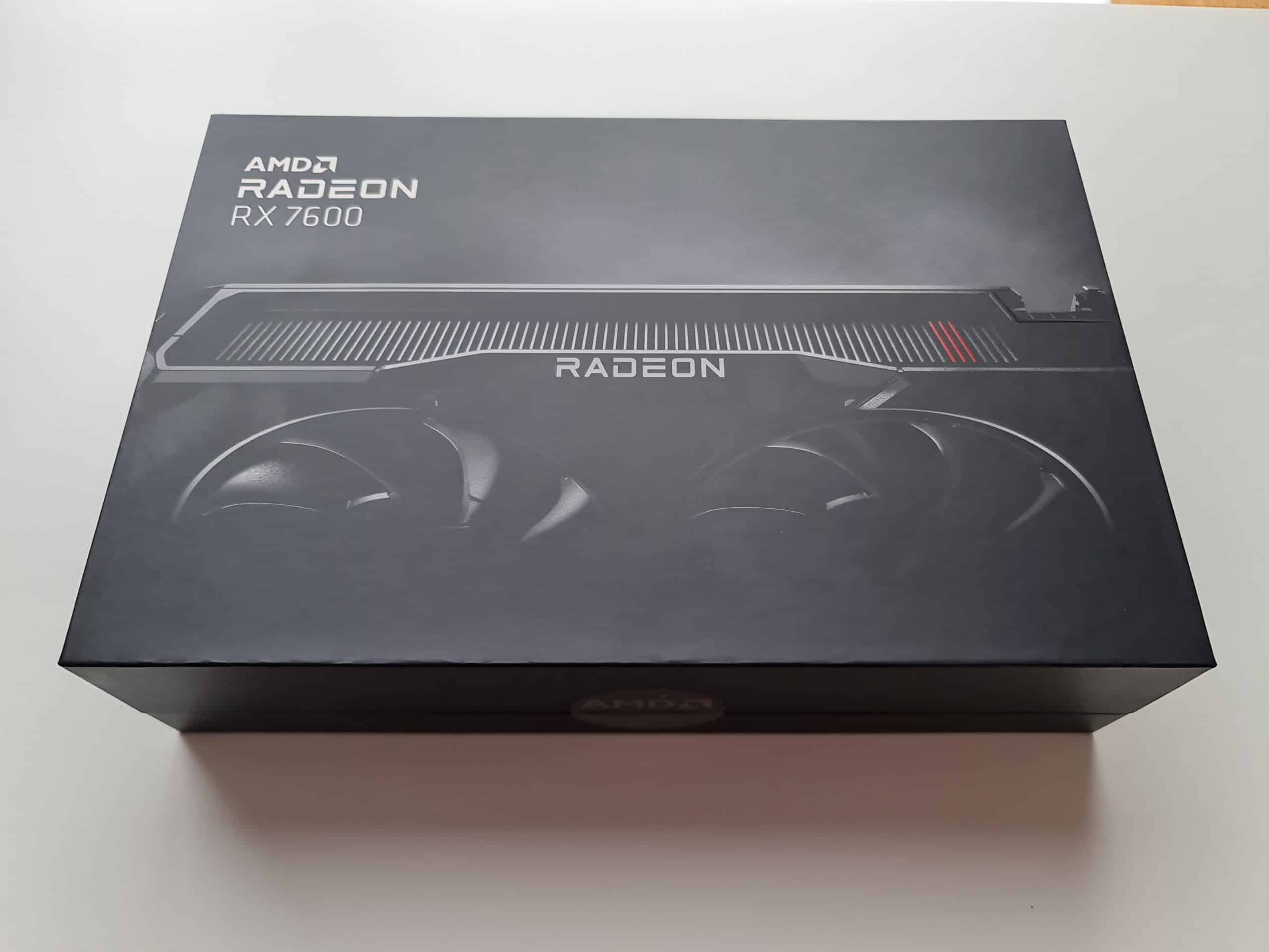 Durante o processo de unboxing da placa gráfica, ficou claro que esta Radeon RX 7600 é verdadeiramente compacta, sendo a própria caixa (da variante específica da AMD) um modelo à escala daquilo que encontrámos anteriormente com as Radeon RX 7900. A caixa tem um design muito elegante, e abre-se como se fosse uma caixa de joalharia, com a placa precisamente ao meio, devidamente protegida nas zonas de contacto (conector PCIe).