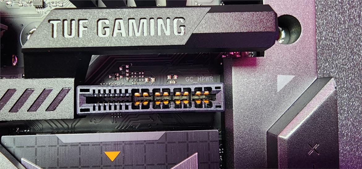 A nova placa chama-se GeForce RTX 4070 Megalodon e funciona em conjunto com uma motherboard ASUS TUF Gaming Z790 BTF, que tem um destes conectores. Por sua vez, esta motherboard tem uma entrada específica onde se liga um dos cabos da fonte de alimentação, para passar a energia para o barramento extra na placa gráfica.