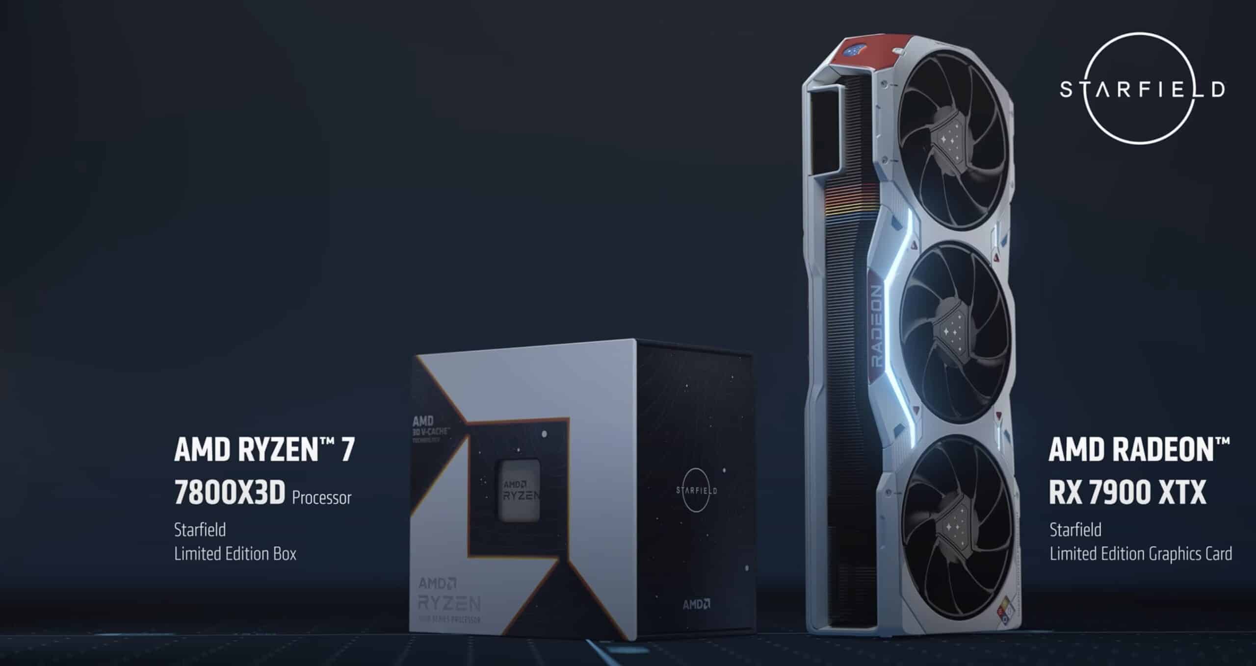 Para marcar o lançamento do jogo de exploração espacial Starfield da Bethesda, a AMD apresentou edições especiais do processador Ryzen 7 7800X3D e da placa gráfica Radeon RX 7900 XTX com decoração nas cores dos jogo: branco, azul, vermelho e amarelo.