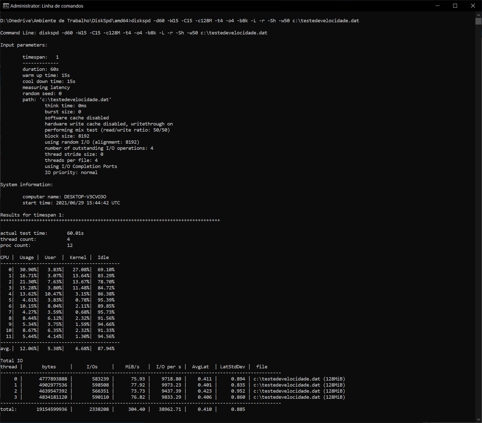 diskspd -d60 -W15 -C15 -c128M -t4 -o4 -b8k -L -r -Sh -w50 c:\testedevelocidade.dat