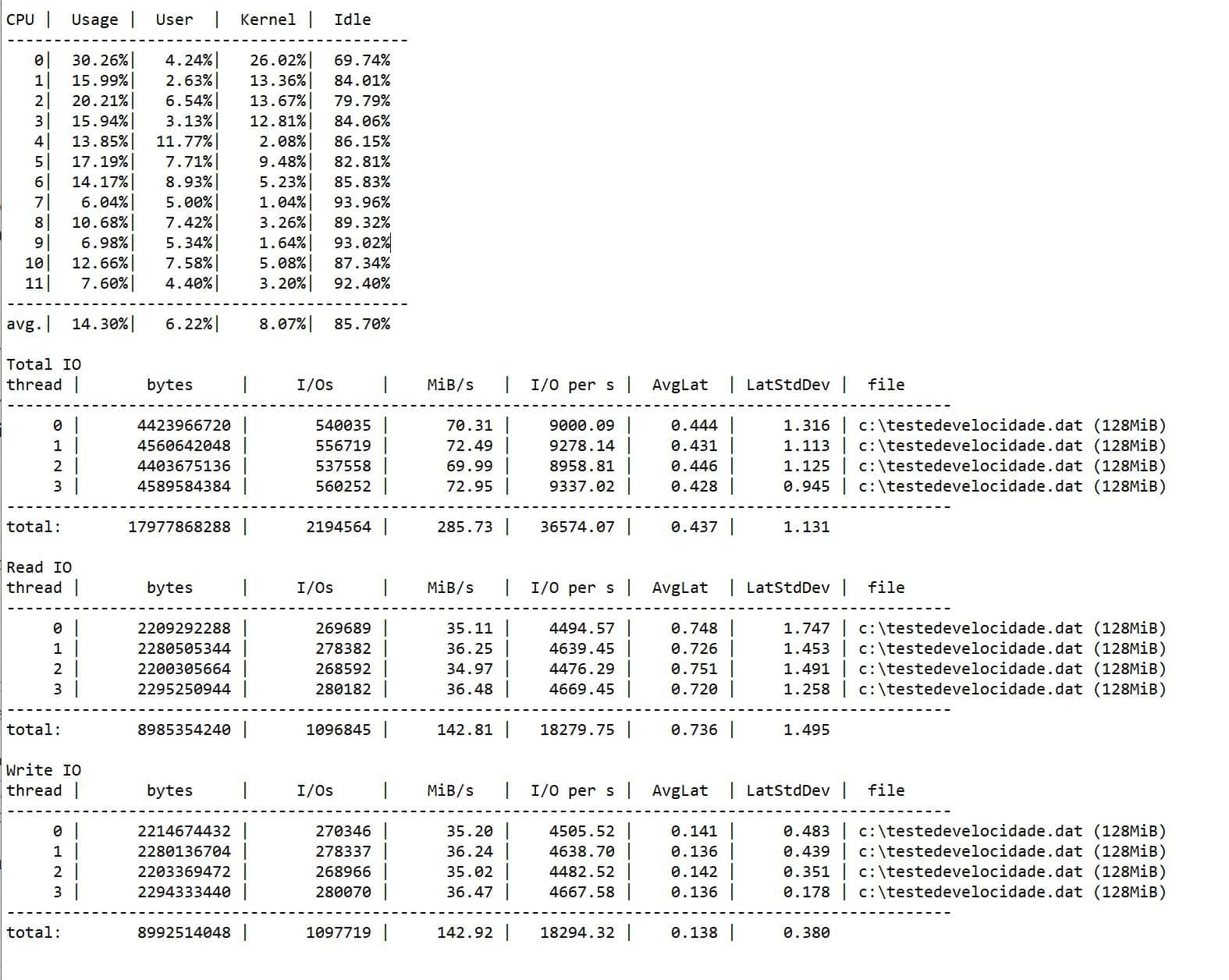 diskspd -d60 -W15 -C15 -c128M -t4 -o4 -b8k -L -r -Sh -w50 c:\testedevelocidade.dat > c:\resultados.txt