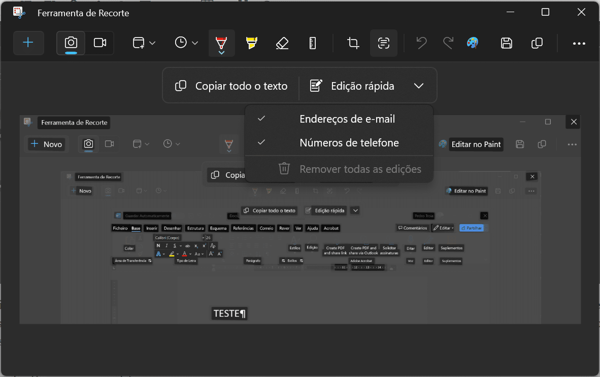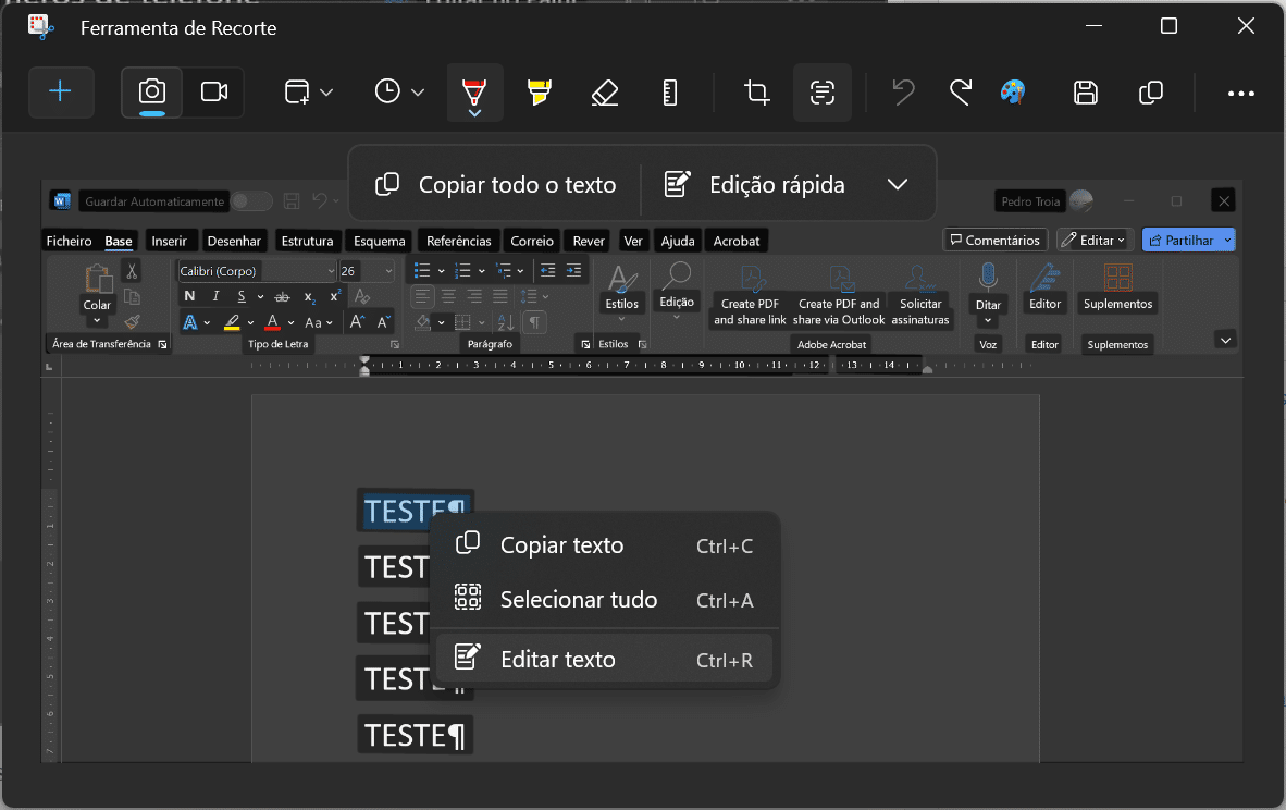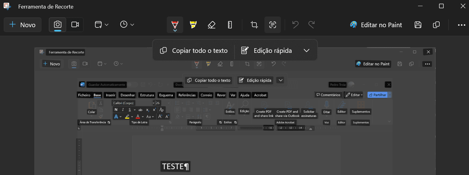Como se pode ver a partir da imagem acima, há um novo botão junto ao botão de edição que se chama ‘Acções de texto’. Depois de tirar o screenshot (neste caso usámos uma janela do Microsoft Word), clique nesse botão. A ferramenta analisa a imagem e detecta todo o texto que contiver. No nosso caso, o programa até reconheceu o texto dos menus.
