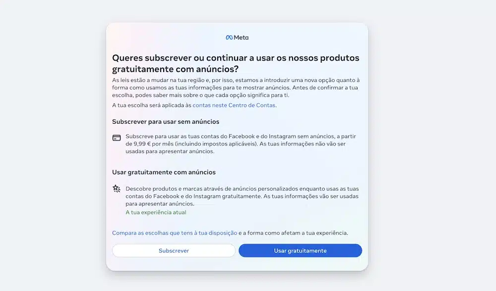 A Meta começou hoje a mostrar um aviso a quem tem conta no Facebook e no Instagram: vai ser preciso começar a pagar 9,99 euros/mês para deixar de ver anúncios personalizados no feed.