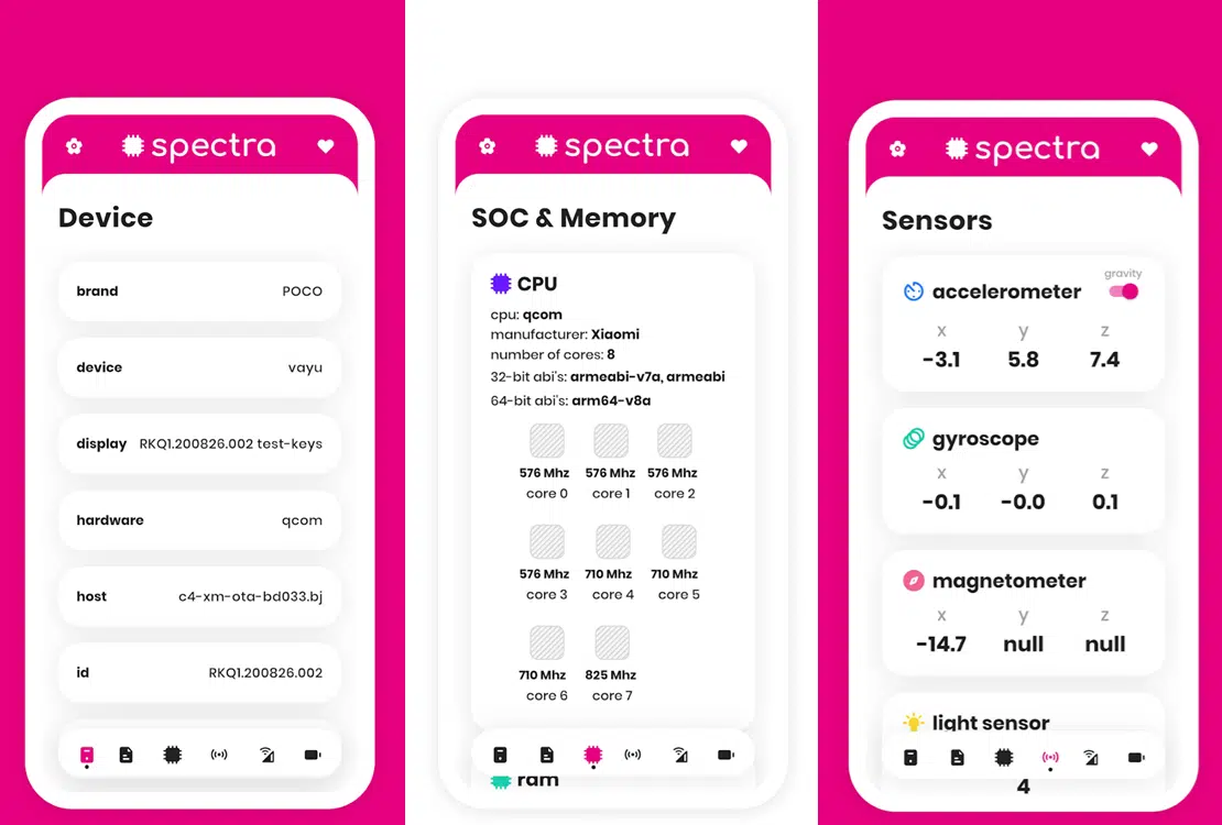 Spectra: device info é uma aplicação para Android que mostra as especificações de hardware, a versão do sistema operativo, a utilização de armazenamento, a conectividade e redes e os dados dos sensores num único local.