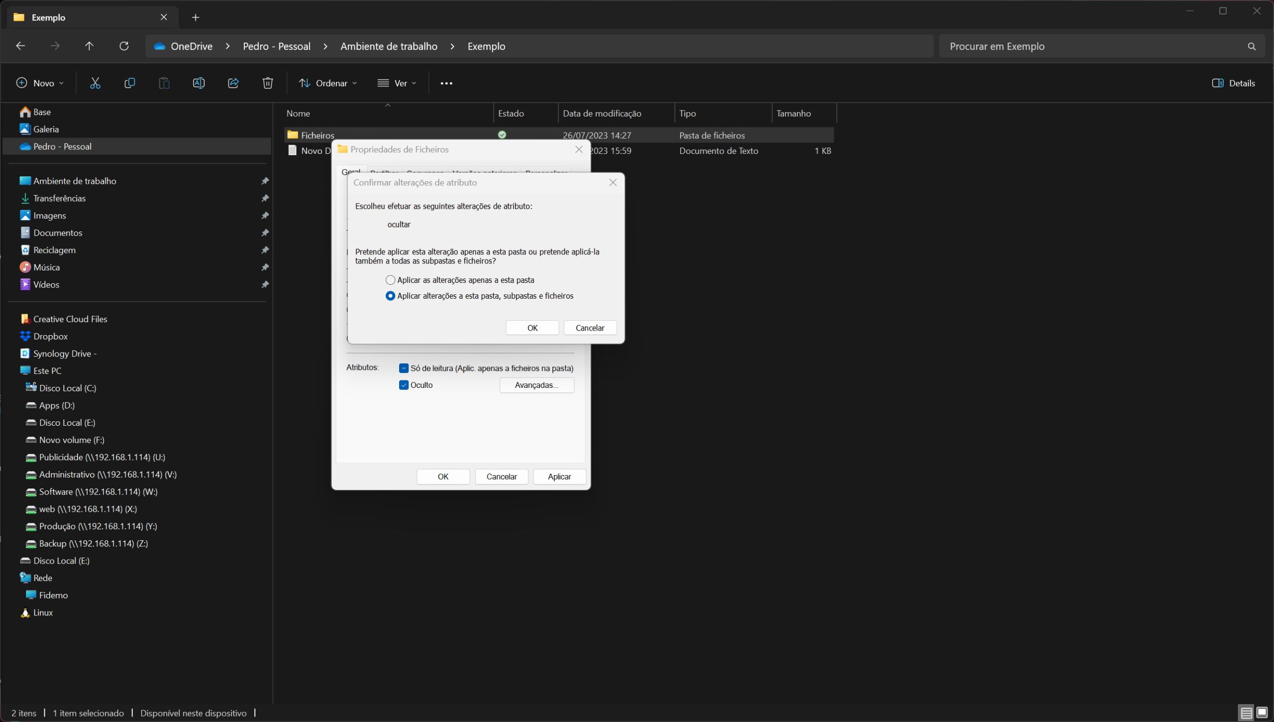 Nessa janela pode escolher se quer esconder todos os ficheiros ou se quer esconder apenas a pasta. Escolha a opção ‘Aplicart alterações a esta pasta, subpastas e ficheiros. Depois, clique em ‘OK’. E depois clique em ‘OK’ na janela das propriedades da pasta.