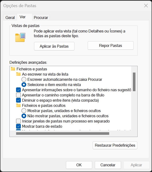 Mostrar ficheiros e pastas através do Explorador de Ficheiros