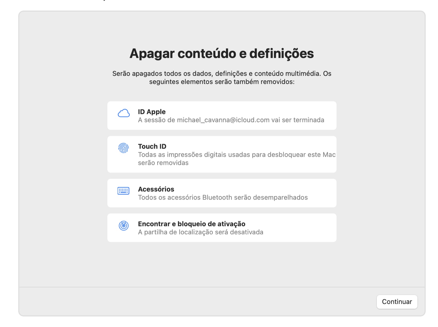 2 – O próximo passo faz lembrar o resumo dos dados que vão ser apagados e serviços a remover, tal como aparece no iPhone. Mais uma vez, veja bem os conteúdos e definições que serão apagados e clique em ‘Continuar’. O macOS pode pedir para inserir as credenciais Apple ID, para validar as instruções de apagar o Mac; assim, no ecrã seguinte, basta carregar em ‘Apagar conteúdos e definições’.