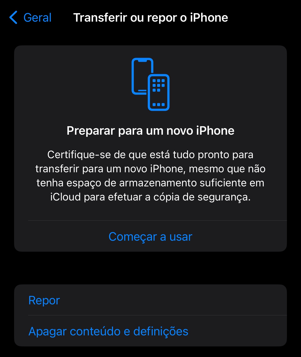2 – Actualmente, quando queremos apagar um iPhone (um ou iPad), este já inicia, automaticamente, uma cópia de segurança para o iCloud, por isso não é preciso estarmos a fazer isto de forma separada. Entre no menu das ‘Definições’ > ‘Geral’ e deslize o ecrã para cima até encontrar a opção ‘Transferir ou repor o iPhone’. Toque em ‘Apagar conteúdo e definições’, leia bem o aviso e confirme aquilo que irá ser apagado.