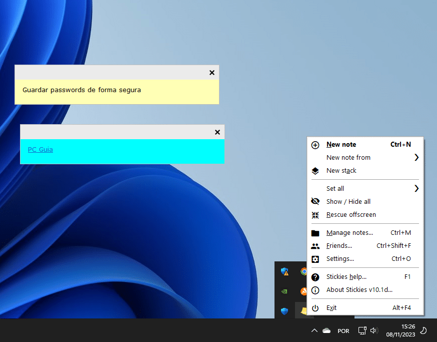Em vez de escrever as palavras-passe em post-its, considere a possibilidade de as guardar em notas virtuais no seu ‘Ambiente de Trabalho’. O Windows 10 e 11 têm uma aplicação para isto, a Sticky Notes, mas preferimos o Stickies, já que é mais versátil. Este programa gratuito permite criar notas com texto e links, atribuir cores diferentes, movê-las para qualquer parte do ecrã, anexá-las a janelas específicas (como a do browser) e ocultar o conteúdo, mantendo as notas “enroladas”, de forma a que apenas o título fique visível.