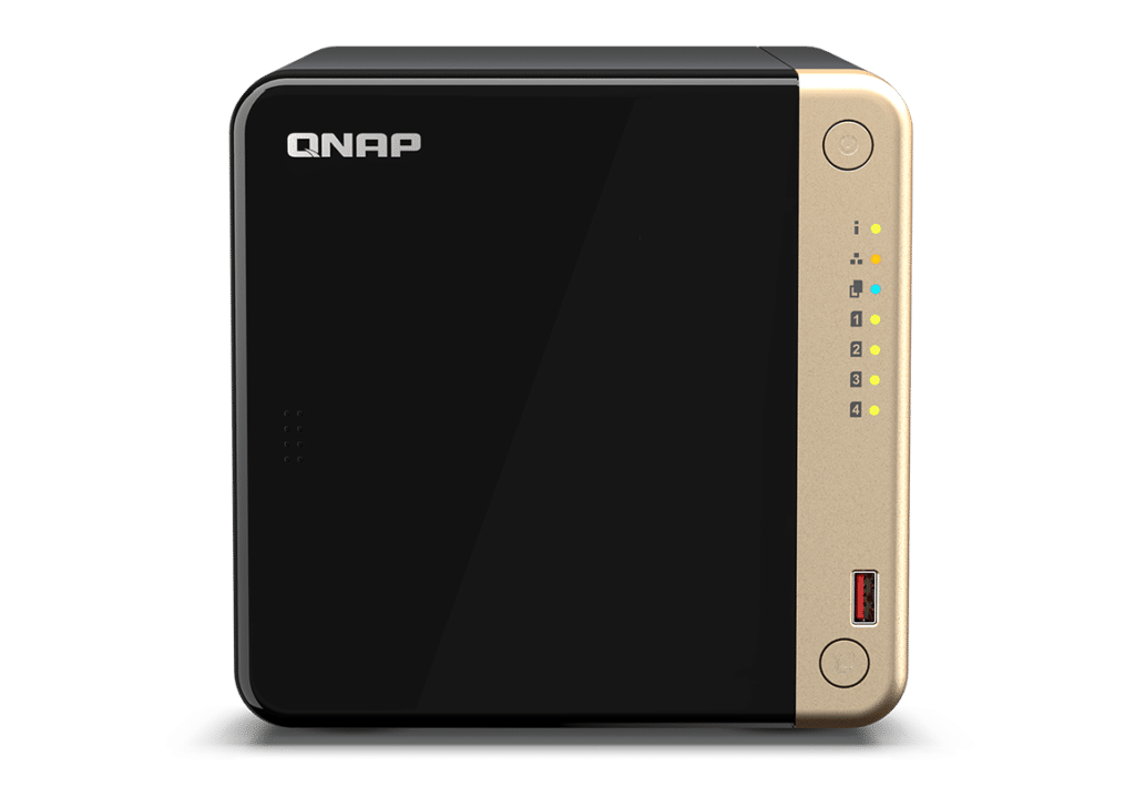 O QNAP TS-464 permite instalar quatro discos mecânicos ou SSD SATA e vem com um processador Intel Celeron com quatro núcleos, que pode funcionar a uma velocidade máxima de 2,9 GHz. Este processador inclui uma GPU Intel a 450 MHz, que lhe permite fazer recodificação de vídeo em tempo real. No que respeita a memória RAM, o QNAP TS-464 pode trazer 4 ou 8 GB, que podem ser expandidos até aos 16 GB. As ligações à rede são asseguradas por duas RJ-45 que permitem velocidades até aos 2,5 Gbps. Também temos quatro entradas USB-A (uma delas frontal) e uma HDMI, que permite ligar o NAS directamente a um monitor.