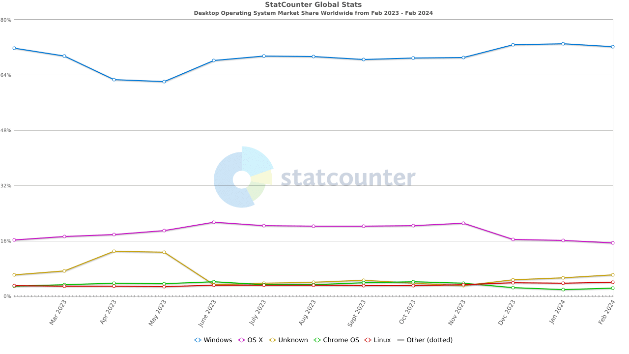 Segundo os mais recentes números publicados pelo StatCounter, um site que segue as quotas de mercado dos browser, sistemas operativo e motores de busca, pela primeira vez o Linux para computadores ultrapassou os 4% de quota de mercado. Este valor não leva em conta a utilização do ChromeOS que, apesar de ser baseado em Linux, conta como um sistema operativo independente. Apesar de o StatCounter não dar nenhuma explicação para o crescimento de utilizadores de Linux, pode-se especular um pouco.