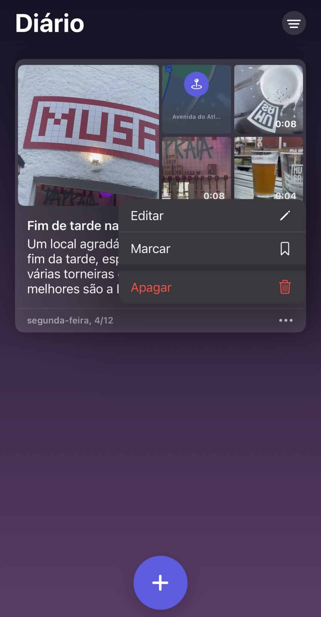 6 – Isto faz com que este momento passe para o ecrã principal da app. Ou seja, para que um momento se transforme em entrada do diário tem sempre de ser gravado como tal, dado que, até aqui, serão apenas recomendações da app. Se quiser escrever mais alguma coisa, apagar ou adicionar multimédia a uma entrada já feita, toque nos três pontinhos e escolha uma das opções. Aqui, também pode ‘Marcar’, para definir uma entrada como favorita. No ícone dos três tracinhos, que está no canto superior direito, pode filtrar as entradas do Diário por ‘Videos’ e ‘Locais’.