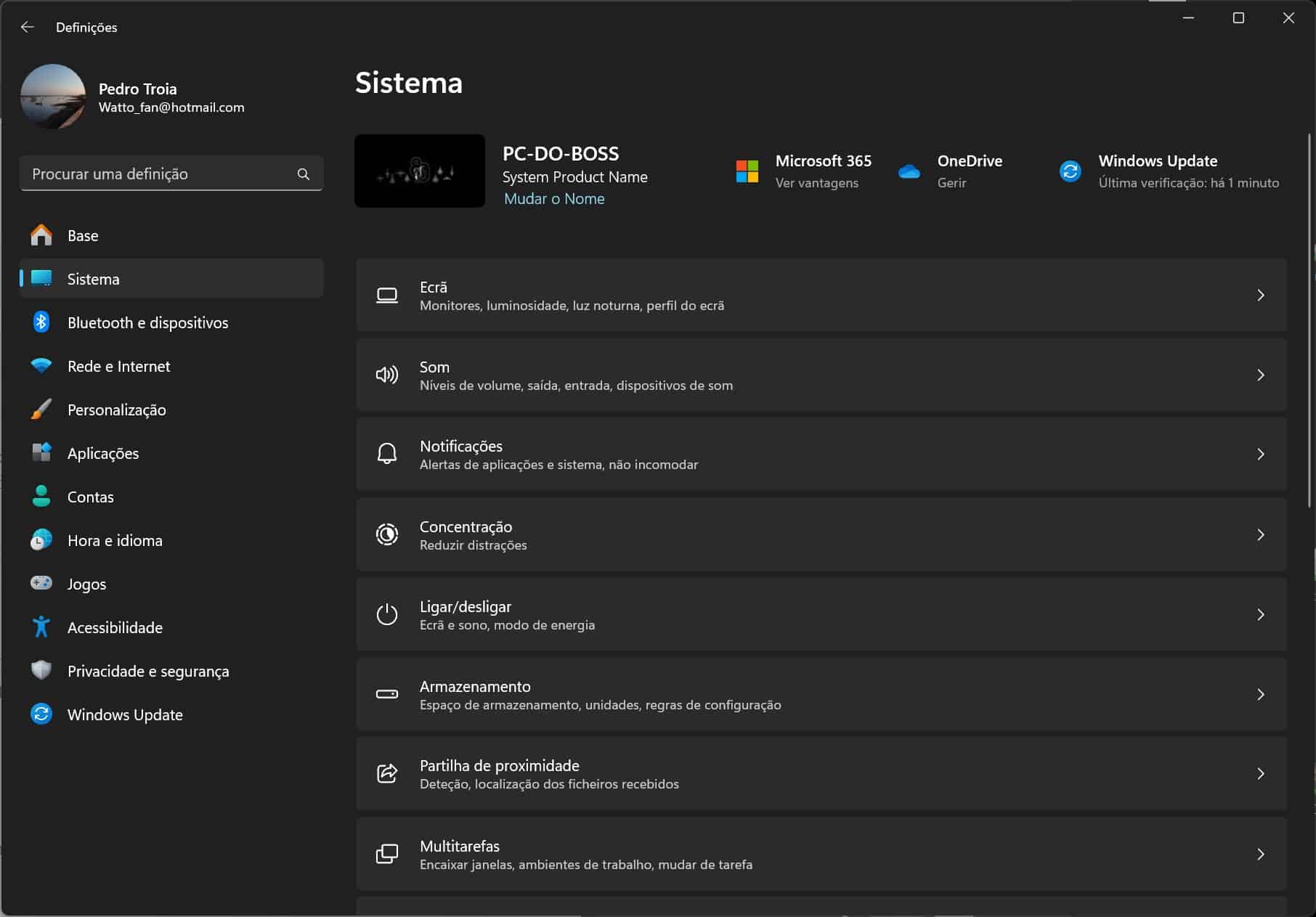 Clique no botão ‘Iniciar’ e escolha a opção ‘Definições’. Em alternativa, pode clicar com o botão direito do rato no botão ‘Iniciar’ e escolher ‘Definições’ no menu que aparece ou ainda pode usar a combinação de teclas Windows+I para aceder directamente às definições do sistema operativo. Depois de estar na janela ‘Definições’, clique em ‘Sistema’ na coluna da esquerda.