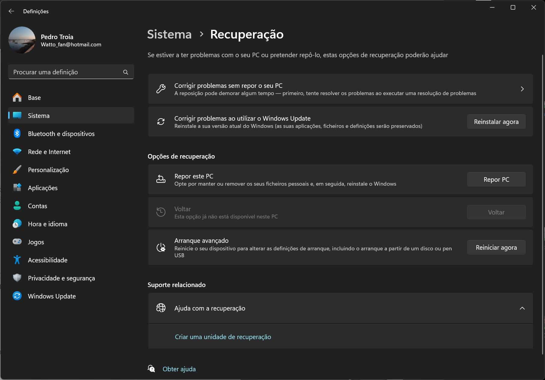 Faça scroll na zona da direita da janela ‘Sistema’ até encontrar a opção ‘Recuperação’ e clique nela.