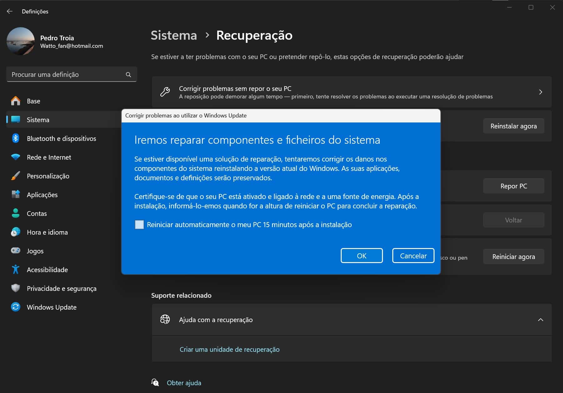Aparece uma janela de confirmação. Pode ligar a opção ‘Reiniciar automaticamente o meu PC 15 minutos após a instalação’ e depois clique em ‘OK’. Assim que o fizer, o PC vai reiniciar e o sistema dá início ao processo de reparação.