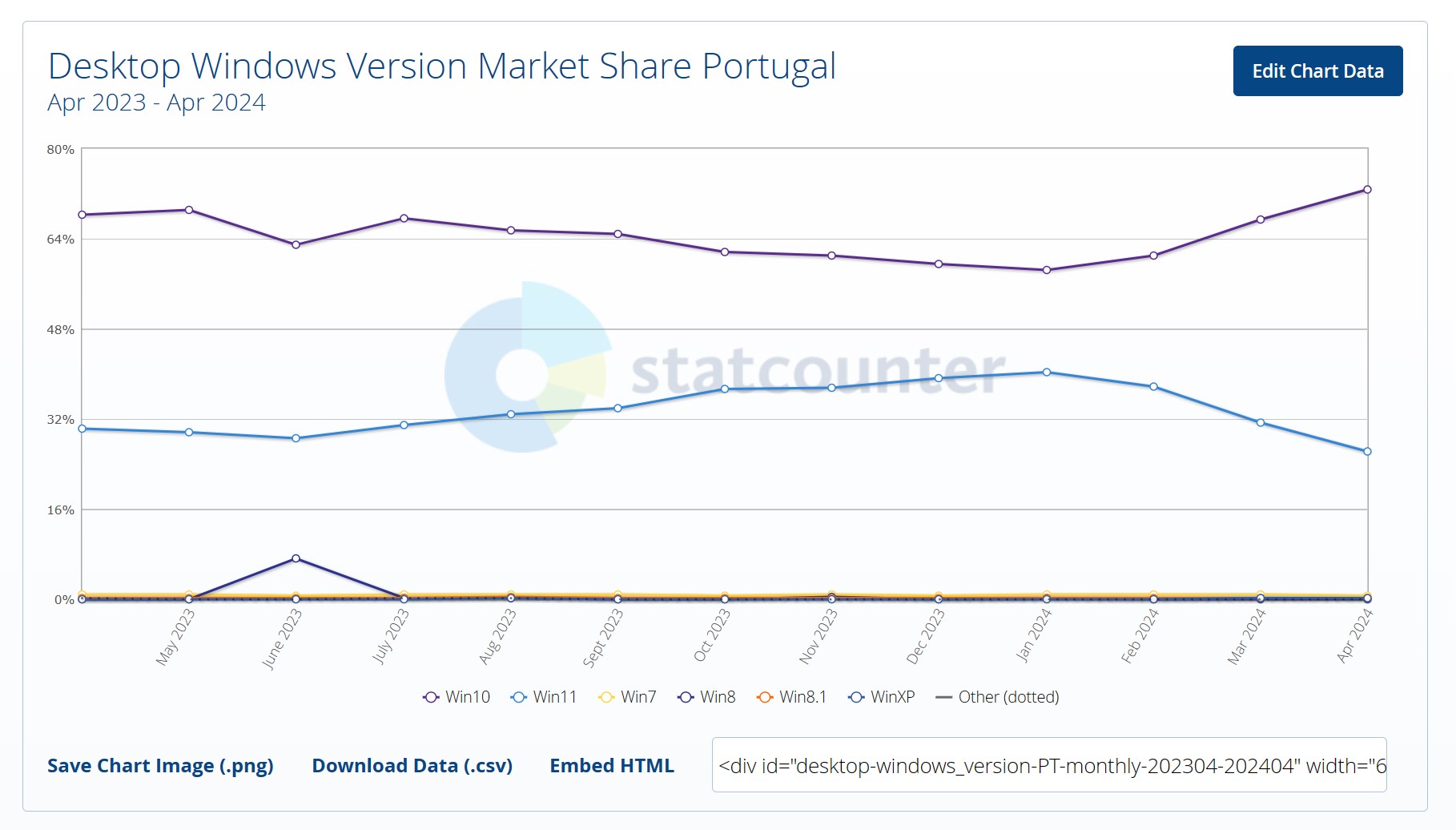 Em Abril, o Windows 10 subiu um 1 ponto percentual para 70,1% de quota de mercado dos utilizadores Windows. No mesmo período, a quota de mercado do Windows 11 desceu ligeiramente para 25,69%, o que pode querer dizer que há utilizadores do Windows 11 a mudarem para o Windows 10. Como o Windows 10 já não vem incluído nas máquinas novas, o mais certo é que este aumento de utilizadores venha de grandes quantidades de computadores recondicionados que têm inundado o mercado. Estas máquinas estão a ser vendidas a preços de saldo mesmo com configurações interessantes para os utilizadores que procuram máquinas para utilizações básicas.
