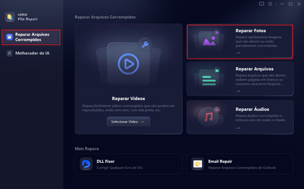 2 – Instale, abra a ferramenta e no menu à esquerda selecione a opção “Reparo de Foto”. Feito isso, vá em “Reparar ficheiros Corrompidos” e aperte “Reparar Fotos”.
