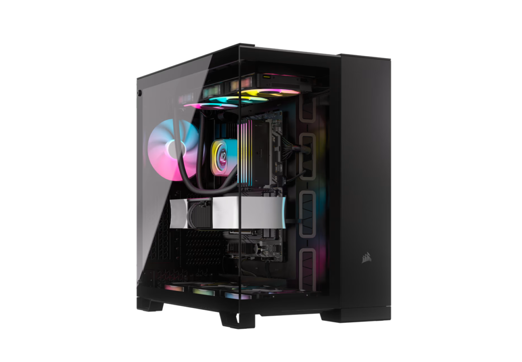 A 6500X da Corsair faz parte de uma nova “família” de caixas para computadores que disponibiliza duas zonas separadas (a Corsair chama-lhes ‘câmaras’): uma para a instalação da motherboard e placas; e outra onde se instalam os dispositivos de armazenamento (dois de 3,5 polegadas e mais dois de 2,5), a fonte de alimentação e que também serve para arrumar os cabos. Esta configuração facilita muito a gestão dos cabos, porque permite que a arrumação seja feita longe das ventoinhas, o que optimiza o fluxo de ar dentro da caixa. A 6500X tem espaço para instalar três ventoinhas de 120 ou 140 mm na parte superior; uma de 140 mm na traseira, três na parte inferior e mais três do lado direito. Em alternativa, estas zonas também podem ser usadas para instalar um radiador para o sistema de arrefecimento (até 360 mm).