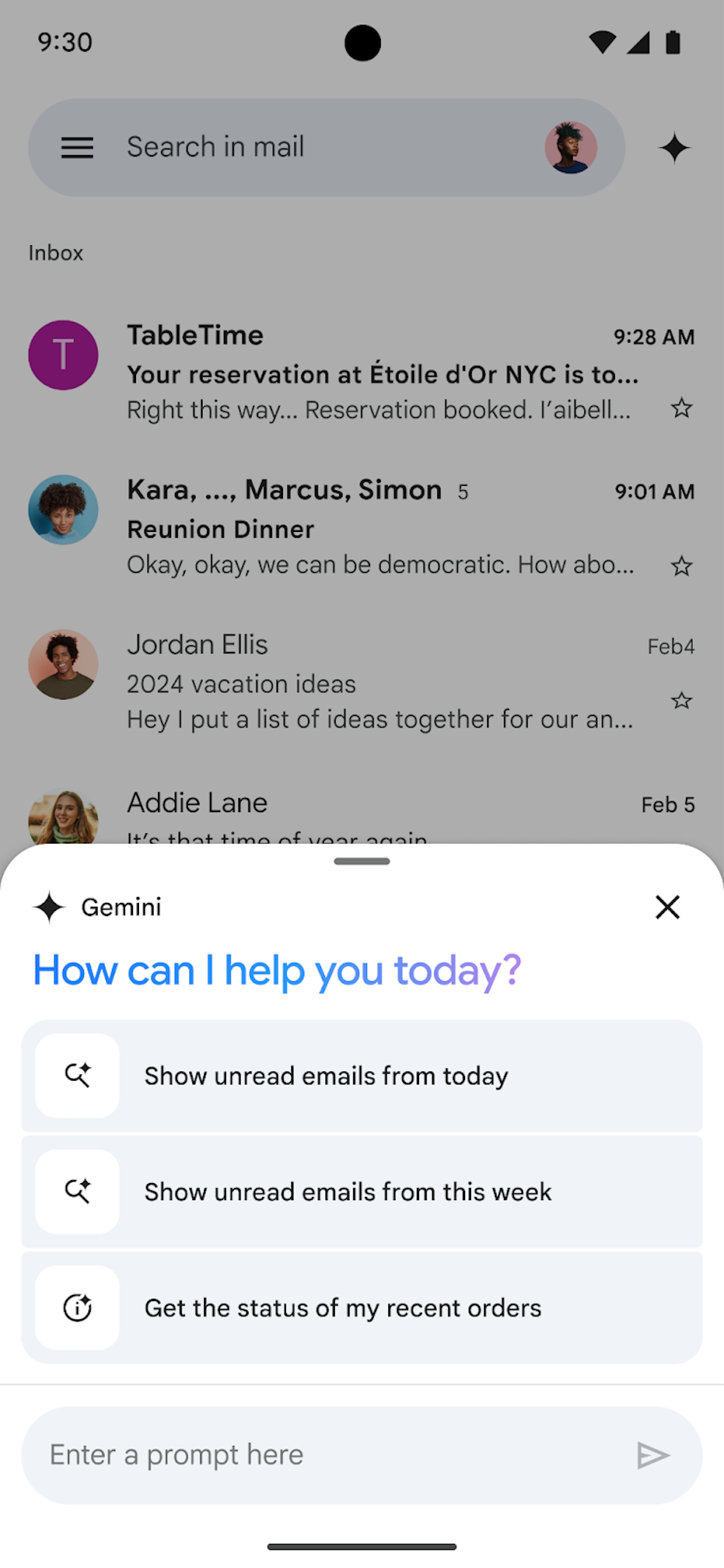 Na app para Android (e, futuramente, para iOS) as possibilidade de interacção são iguais às do site Gmail: «Pode pedir ao Gemini para procurar na sua caixa de entrada informações como ‘Qual é o número do pedido de compra da minha agência?’, ‘Quanto é que a empresa gastou no último evento de marketing?’ ou ‘Actualize-me sobre os e-mails relativos ao planeamento trimestral’», descreve a Google.