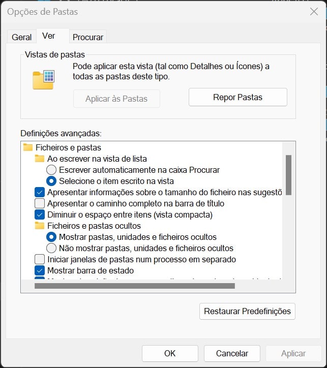 Na janela que aparece de seguida, clique no separador ‘Ver’.