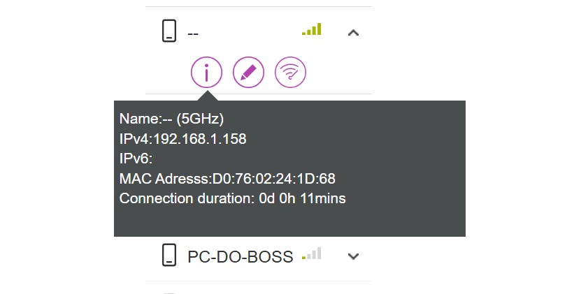 Para ver os endereços MAC pode aceder à lista de dispositivos ligados que está na interface do router. Esta lista contém normalmente o nome do dispositivo, o endereço IP que lhe está atribuído e o endereço MAC. O único inconveniente desta solução é que, cada vez que trouxer um novo dispositivo para casa, tem de o adicionar à lista de dispositivos reconhecidos.