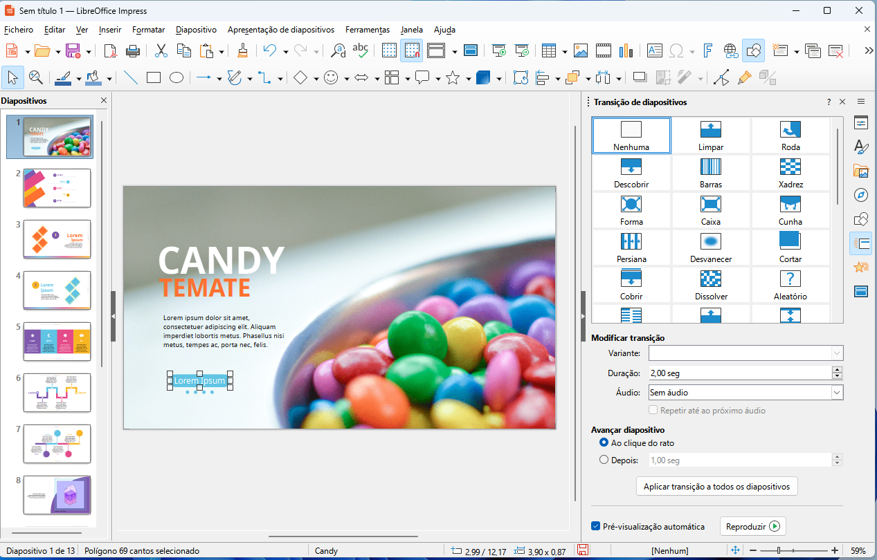 O alinhamento dos diapositivos funciona de forma muito semelhante ao PowerPoint: basta clicar e arrastar para o local desejado. Se quiser ter animações nos slides, escolha ‘Transição de diapositivos’ para que as diversas opções apareçam no painel do lado direito: clique em cada uma destas para pré-visualizar o efeito e, depois, no botão da parte inferior do painel para ‘Aplicar a transição a todos os diapositivos’.