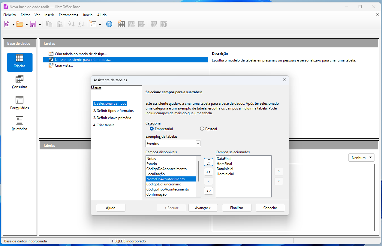 Clique em ‘Utilizar assistente para criar de tabelas’ e, depois, escolha se quer uma tabela ‘Empresarial’ ou ‘Pessoal’. Em seguida, na área ‘Exemplos de tabelas’, seleccione a que quiser, sendo que existem diversas opções como ‘Tarefas’, ‘Eventos’ e ‘Fornecedores’. Cada uma tem um determinado número de ‘Campos disponíveis’, por exemplo, ‘DataInicial’ e DataFinal’, que pode adicionar ou remover usando os botões das setas. Quando tiver todos os parâmetros em ‘Campos selecionados’, faça ‘Finalizar’.