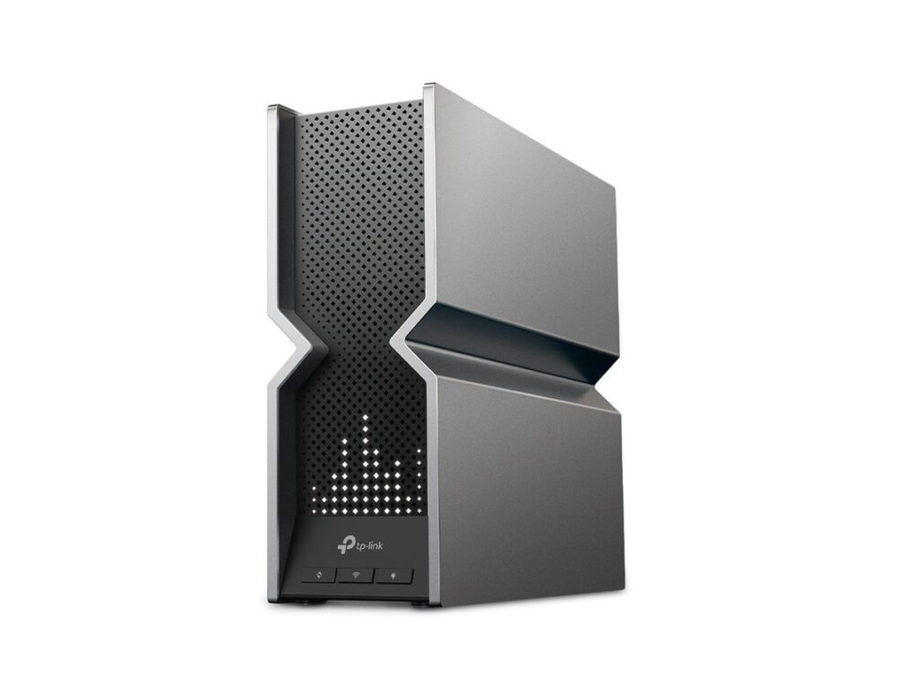 O BE800 não se parece com qualquer outro router TP-Link já visto. A sua caixa tem mais ou menos a forma de uma ampulheta e tem quase vinte centímetros de altura e profundidade, dimensões que são mais semelhantes às de um pequeno PC de secretária.