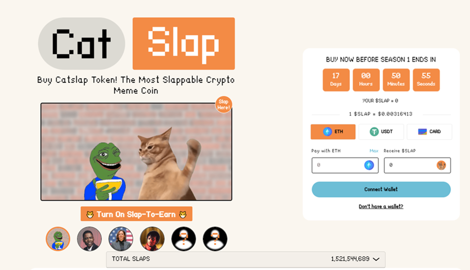 CatSlap tem uma ideia simples: é uma criptomoeda de gaming em que encarna um gato irritado que quer dar patadas na cara de figuras da nossa cultura popular. Grandes políticos e figuras mediáticas são o alvo deste gato temperamental, e quantas mais patadas der, melhor posicionado fica num ranking global que lhe permite aceder a prémios.